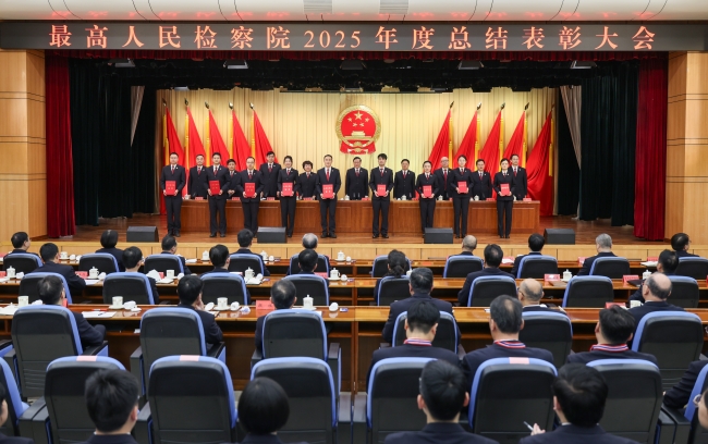 2月12日,最高人民检察院举行2025年度总结表彰大会,回顾过去一年工作,表彰表扬机关优秀部门和先进个人,展望新一年工作。最高检党组书记、检察长应勇出席会议并讲话。最高检党组副书记、常务副检察长童建明主持会议,党组成员、副检察长葛晓燕宣读最高检从检30年检察荣誉章获得者名单,党组成员、政治部主任滕继国宣读最高检2025年度考核表彰决定。出席会议的最高检领导、检委会专职委员为检察荣誉章获得者和优秀部门、立功及考核优秀个人代表颁奖。
